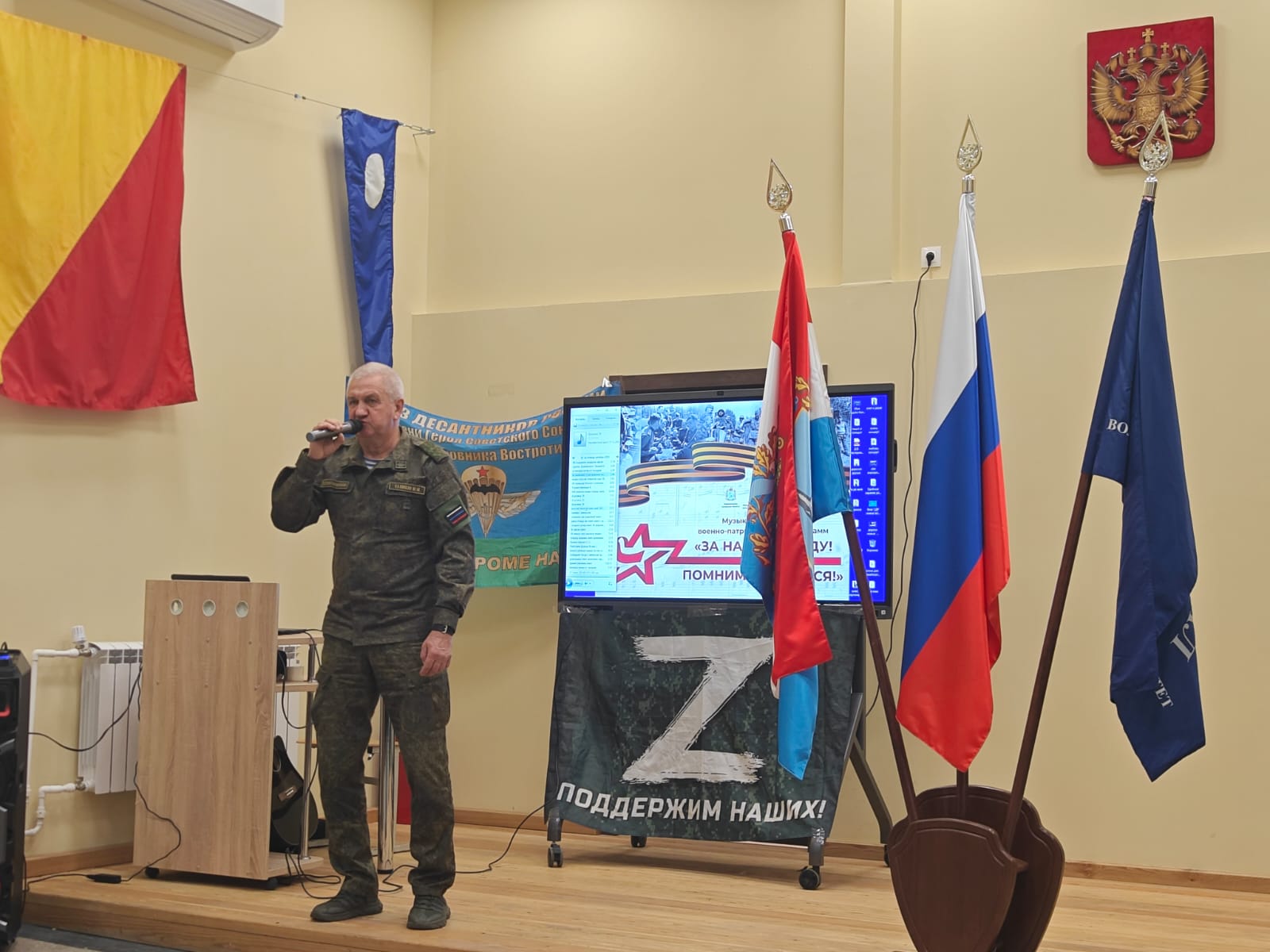 18 октября в одном из гарнизонов Самарской области прошла программа Союза десантников России "ZА Победу" в поддержку СВО. На мероприятии присутствовало 320 слушателей Получили горячий приём и аплодисменты зала, а также грамоту от командования.