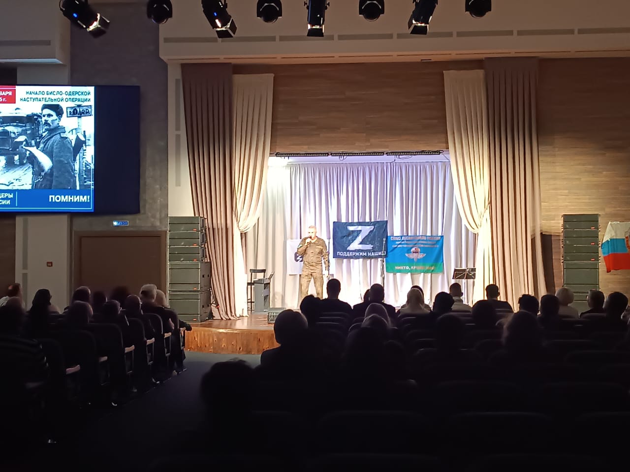 24 октября прошла программа Союза десантников России в поддержку СВО "ZA Победу". На мероприятии присутствовали 410 человек - 15 участников СВО. Получили горячий приём зала.